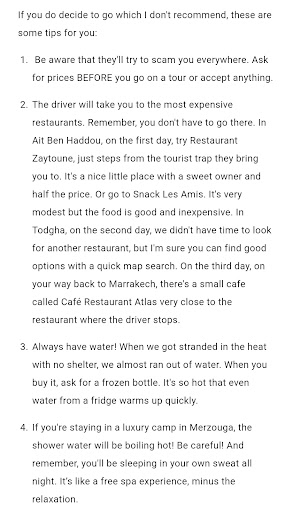 Unfortunately, the list ofhe problems we had is much longer: Bus. The "bus" is actually a large van, not suited for long-distance drives. It's uncomfortable, and the AC barely works. In the morning, it's tolerable, but as the day progresses, it becomes an oven. Considering you spend most of your day in this metal box, it becomes a form of torture. Road accidents. Our van broke down twice. First time, in the middle of nowhere near the desert, one of the wheels practically exploded, and the driver wasn't prepared for an emergency at all. It took about an hour to fix it. We all had to wait outside in the scorching heat (it was 42°C/107.6 °F) with two kids in our group. It didn't feel safe at all. The second time, another wheel deflated, but thankfully we were in a café, so we waited there. I believe a driver should be better prepared for situations like this if he travels to a desert and prioritize passenger safety. Communication. Communication was another adventure. Our driver spoke English on a need-to-know basis, and apparently, we didn't need to know much. He would occasionally drop some vague information to the front-seat passengers, leaving the rest of us to play a game of "Guess What's Next". Most of the time, he conveniently "forgets" English when you ask questions. Scammers. Everyone you meet on the trip is trying to scam you. The second your driver parks, a "tour guide" jumps into your van and announces he's taking you on a "tour." It happens so smoothly that you don't question it. Most people just follow him, not knowing it's not free. If you do ask how much it costs, he'll say he'll tell you after the tour. If you insist on knowing, he gets aggressive. We had a very frustrating experience with a guide in Todgha Gorge which is worth its own post. Nobody cares. When people aren't trying to scam you, they treat you like a nuisance. This was especially true at our camp in Merzouga. We first arrived at some hotel there, and the staff weren't even aware we needed transportation to the camp. We had to wait an hour in 46°C/ 115 ℉ heat for them to get us a car. They fail to deliver. In the morning, you're supposed to take a camel ride to see the sunrise. Except they forgot to bring a camel for my friend. She spent her desert tour at the camp, looking at sand. The one thing she wanted from this trip was to see the desert, and she ended up with the world's saddest staycation. Limited time in the desert. You have just a few hours in the desert. They bring you 30 minutes before sunset and then leave at 7 in the morning. You don't have time to see anything. Blink and...
