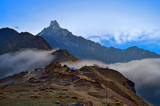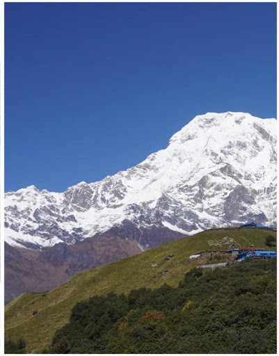 Elevation: 5,587 m; Annapurna region ranges from 1,000–8,000 m. Features forested ridges, alpine meadows, and rocky slopes below Machhapuchhre. Connected by trails to Machhapuchhre Base Camp, with views of Annapurna I and Hiunchuli. Moderately challenging terrain, suitable for trekkers with basic fitness.