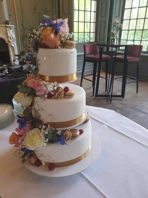 Op de trouwdag zelf stond de prachtige taart er in vol ornaat bij, ze was ook heel erg lekker (crème-framboos).