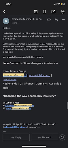 At first, I was happy with the service. Arthur was helpful when I bought a €2000 engagement ring. But once the payment was made, the service ended.