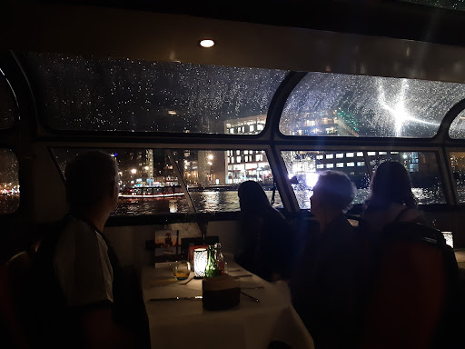 First of all, we had an enjoyable evening and the staff was lovely. However, the dinner cruise with 4 courses did not meet expectations. First of all the website states âOn the large boat, you will also get to take your pick out of an extensive selection of fine winesâ, but aboard you could only decide between one red and one white wine, which was a major disappointment. We had one fish and one meat menu, for which both starters were lovely, and did meet expectations. The second course was a tomato soup, which was ok but nothing special. For this price I was expecting to find more exciting flavours in there, maybe something like a fresh pesto. But it was quite plain. The meat main course was tasty. Nothing really fancy but it was good. However, the fish main course was a disaster. It had two types of fish, both of which were overcooked and therefore very dry. The pasta was overcooked too, which means it had no bite and was very mushy. The flavours were only ok. The website talks about culinary delights, the Dutch version of the website repeatedly talks about how tasteful the evening will be and how your taste buds will be triggered. Therefore I was expecting more than just âokâ food. My taste buds did not experience anything exciting. The dessert was not very good either. I am not a difficult person with dessert, but this must have been the worst cheesecake I have ever had. My partner called it the worst dessert he ever had. The flavor and texture were not nice at all. The menu aboard said we would get coffee or tea afterwards, but upon requesting tea I am being told they only serve coffee. The sweets we got with the coffee were just 'okâ again. All together we had an enjoyable evening. But the dinner does most definitely not meet expectations based on the website and the price. I would not recommend this dinner cruise to anyone, as it is vastly overpriced for the quality of food you are served (we paid 89 euros per person for this!). I would recommend you to take a normal cruise, and then have dinner at a...