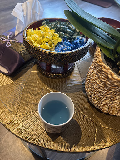 She had me take off my shoes and socks and put on slippers before taking me back to an area enclosed with curtains. She had me sit down and came back with hot green tea and a tub of hot water and sliced lemons to soak my feet. After drying my feet she instructed me to take off my clothes and lie face down on the table. She left to let me undress and came back after I was laying on the table, with what she called tiger balm (analgesic like biofreeze) and a hot sponge wrapped in some kind of leaves.