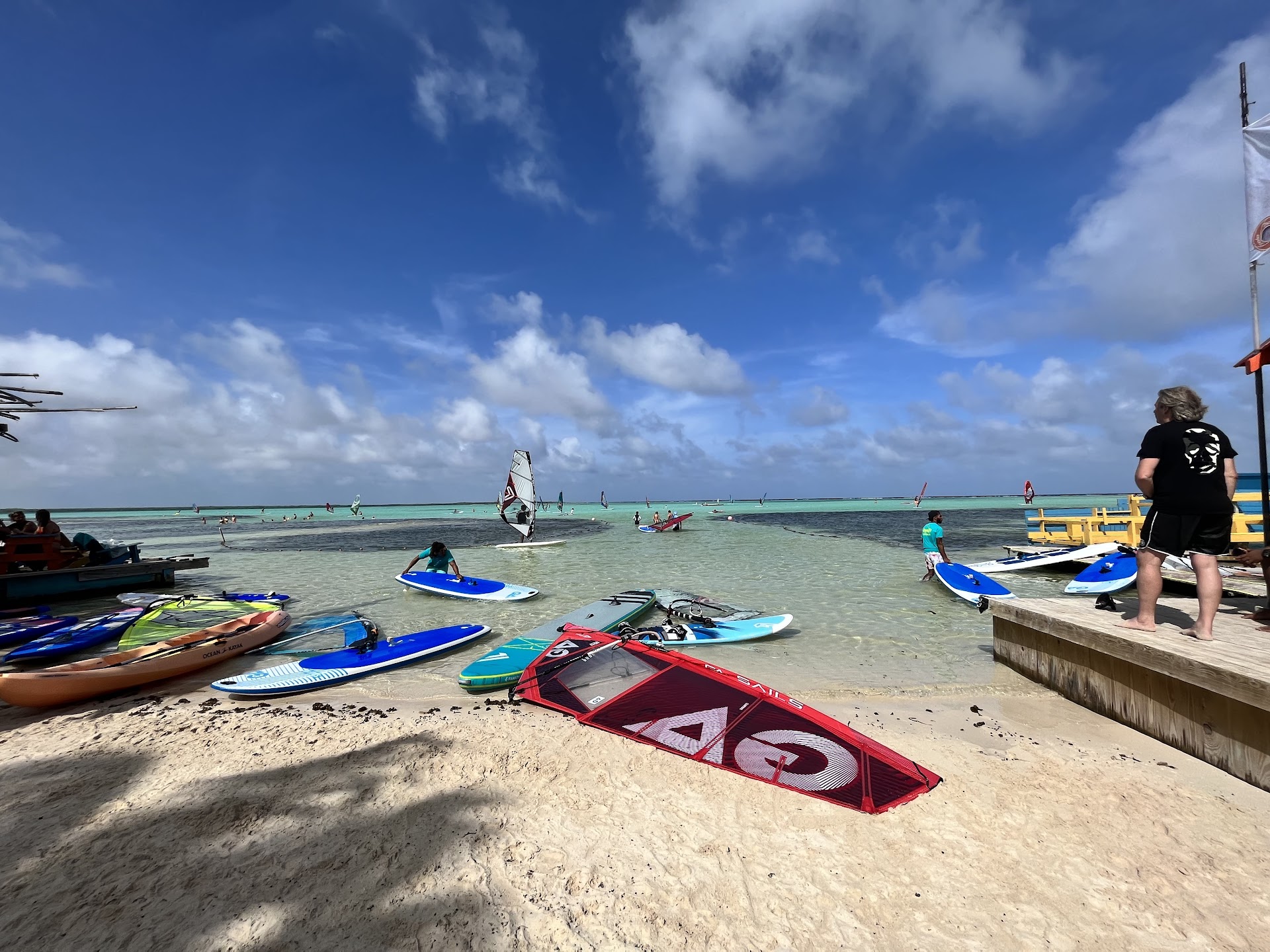 Pros: Best location in Lac Bay, great place for socialising with fellow surfers, beach boys are terrific and always there to help carrying stuff/select sails and board or just to chat about surfing, broad selection of freeride/wave/freestyle boards and sails