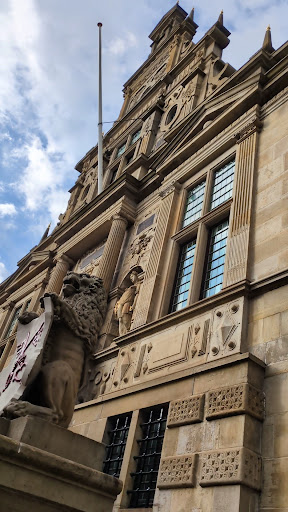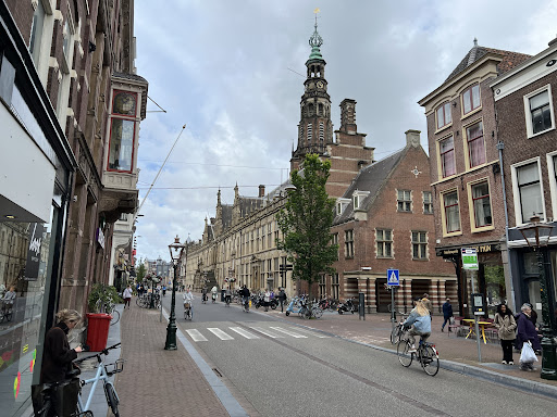 Een gebouw dat zijn weerga in Nederland niet kent, zo denk ik erover. Het kan echt wedijveren met de mooiste gebouwen in Holland of zelfs in Nederland. Het aantal interessante details in de afwerking is bijna niet te tellen en daarbij is het monumentale gebouw recentelijk gedurende een jaren durende opknapbeurt, gerenoveerd en vandaag de dag als ´door een ringetje te halen´, zo mooi. De hoofdreden dat het gebouw niet de waarde krijgt toebedeeld die het verdient is overigens wel een legitieme reden. ´Broadway´ ofwel de Leidse Breestraat... zij is immers de naamgever van Broadway is een regelrechte ramp qua verkeersplanning, en een ramp waar nog geen enkel gemeentebestuur in de laatste decennia tot nu toe mee uit de voeten kon... Ten eerste is het ´het grootste tochtgat van Leiden´, dit komt voornamelijk door haar Noordwest lopend naar Zuidoost ligging, die is ongunstig. Het is er altijd kil, en ´een trekgat´ dus van jewelste. Het 2e nadeel is nog groter: een lawaaieriger en stinkendere plek in ons land ken ik zelf niet. Het lawaai van per dag duizende keren passerende bussen, oude tweetakt Thomos brommers ´from Hell´, brommers die blauwe walmen uitbraken achter de vermoeid ogende bestuurders, en dan niet te vergeten de pizzakoeriers die langs´knallen´ of ze levensmoe zijn en vooral ook de eeuwig heen en weer rijdende schoonmaakvehikels van de gemeente die een werkelijk razend lawaai maken..., deze verkeersdeelnemers zorgen tezamen voor de zeer onaangename omgeving waarin het stadhuis zich bevindt. De stoepen op de Breestraat zijn daarbij ook nog eens zeer smal en de aangrenzende panden relatief zeer hoog waardoor alle lawaai versterkt wordt en de uitlaatgassen blijven hangen. Ik stel u maar u op de hoogte van deze belangrijke ´details´, gronden waarop u wanneer u daar eenmaal aangekomen bent het liefst meteen weer vertrekt... Nou een ander detail op het gebouw zelf dan maar: derde raam vanaf rechts (vanaf de hoek) ´met cafe ´Burgerzaken´ in de rug´, kijk naar het middelste ornament vlak boven het onderste raam, dus op de begane grond, u ziet daar ´een man en vrouw en een huisje´. Waarom zou iemand dat symbool daar nu stiekem, vanuit liederlijkheid of andere vorm van genomen vrijheid, uit het zandsteen geschraapt hebben? Graag hoor ik uw antwoord. O ja, het voor het stadhuis gebruikte zandsteen kwam uit West-Duitsland en wel uit ´Bentheim´ uit een zandsteengroeve aldaar. Daarna werd het eerst naar Bremen gebracht, daar werden de zandsteenblokken op maat gezaagd en genummerd. Uiteindelijk kwamen ze zo in Leiden terecht. Dit Stadhuis is echt markant te noemen: qua vormgeving, de trappartijen, de Rijnlandse roede die er aan de buitenmuur is bevestigd, en de schitterend aangelegde ´Speakerscorner´ die u via een klein trapje betreedt. Daarna mag u daar uw verhaal doen aan het razende verkeer en een enkele voorbijkomende wandelaar. Of die gaan luisteren naar u hangt direct af van de kwaliteit van uw betoog. En een beetje van uw...