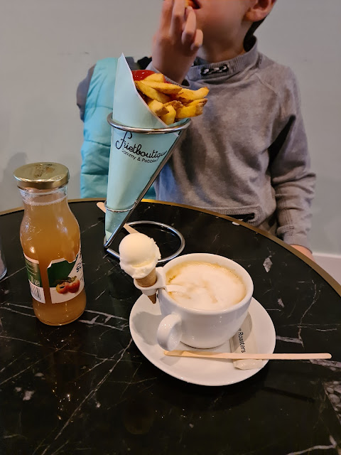 Nieuwsgierig naar nieuwe Frietboutique in "het dorp". Kleine friet met mayo besteld bij een vriendelijke medewerkster. Helaas erg chaotisch in de zaak (grote groep jongeren die uitgelaten en zonder enige consideratie voor omgeving, in coronatijd nog ten tijde van 1 1/5 meter mij en andere klanten van de sokken liepen met flesjes, kratten e.d. t.b.v. een feestje) dus buiten gewacht, eerst aan een wiebelende tafel maar uiteindelijk ook hier weggegaan mede door toedoen van zelfde groep mensen die kratten en dozen op tafel deponeerden. Na een lange wachttijd friet binnen opgehaald en meegenomen vanwege de chaotische sfeer. Helaas, patat was vet en slap en voldeed absoluut niet aan de verwachting. Persoonlijke conclusie: leuke locatie, helaas te krap voor dubbel concept van friet en ijs (zeer smalle doorgang tussen voor- en achterzijde), zitje buiten zou beter aangepast moeten worden aan scheef trottoir (helft van ronde bank/tafel "zweeft") of gemeente moet hier iets aan de stoep doen....maar bovenal de friet zou wat mij betreft krokanter mogen zijn en minder vet. Ijs niet uitgeprobeerd, zag er op zich goed uit maar beperkt aanbod. Nogmaals mijn persoonlijke mening, en geen...