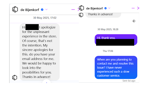 In the image you can actually see what has happened in few weeks, technically nothing. I hope that De Bijenkorf actually reaches out to me to fulfill their promises..