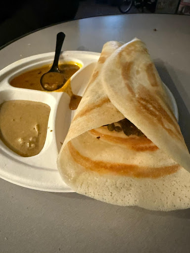 I went there on a Friday after 6.PM. I had dosa with peanut chutney (really good chutney, I'm not a fan of chutneys, this was the best I had so far). Further there was a samosa and chicken pakoras, again, a delicious side dish, worth coming back for more. I was asked whether I wanted a fizzy drink to go with it. I said I'm a bit under the weather, so no cold drink for me, thank you. After I paid, I got a delicious cardamom chai, free of charge, to get warm (it was rainy, windy and cold that day). This is one of these places where it might not seem like a lot is happening inside, but when you DO decide to try it out, you'll get excellent street food with a fantastic service and a genuine human touch. I'll definitely be...
