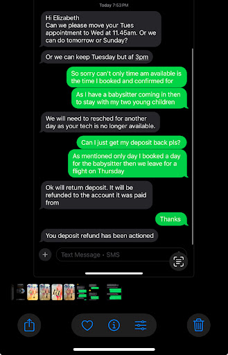 Unfortunately, shortly after all the confirmation notifications, I received a text telling me the person who was going to see me canāt.