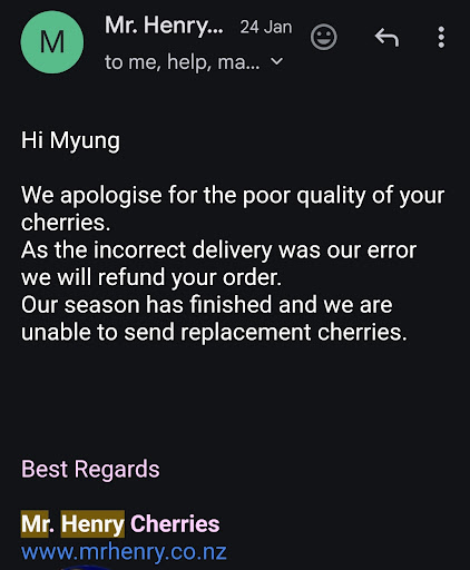 Read moreI ordered my cherries months in advance and they never turned up on the delivery date I had requested. I had requested a delivery date of 28/12 and according to NZ Post courier's tracking they left the seller's on the evening of 27/12, arrived at the Chch Airport depot on in the early hours of 29/12 (so they were never even in Chch on the intended delivery date) and eventually landed on my doorstep on the afternoon of 29/12. They were lukewarm from sitting god knows where for almost two days!! Not only were they lukewarm, they looked like they were picked days ago, hardly fresh at all! The cherries I saw in the supermarket this morning looked a truckload fresher than these. If my cherries are going to be delayed then at the very least refrigerate them until they are delivered! I have contacted Mr Henry Cherries on both email and on Facebook Messenger wanting to know the whereabouts of my cherries and they have not even had the decency to reply. Looking at other's reviews this seems to be a very common issue. They also don't appear to have a contact phone number so trying to get in touch with them is next to useless. I've bought from this business for several years but never again and I certainly won't be recommending...