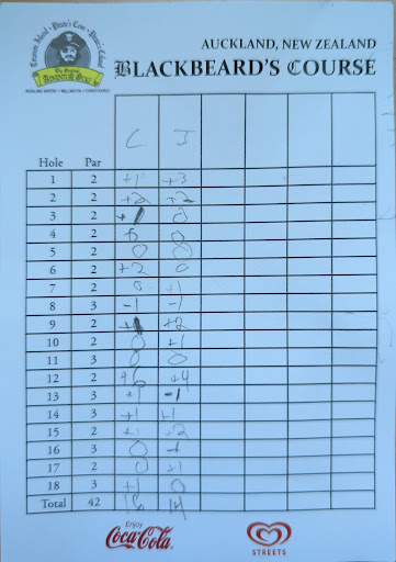 Nice mini golf! I might be biased having beaten my dad, but the course was a lot of fun. We chose the hard "Blackbeard's Course" which was 18 holes and took about 45 minutes. Great way to kill time waiting for a flight, or if you're in the area already, it's a fun way to spend time, period. 😁 The theming of the area is nice, there's a slightly confusing area where the two courses cross each other but each hole is clearly labeled so you don't end up on the wrong course. There's one hole (12) that's incredibly difficult as it's just a hole at the top of a small hill. The holes are extremely we maintained and they don't help the ball in... So if you suck like me 12 is a bit brutal 😂. The nice retiree chap who mans the counter is also a knowledgeable former Air New Zealand staff member so he pulled up the info to make sure we had time which was awfully nice of...