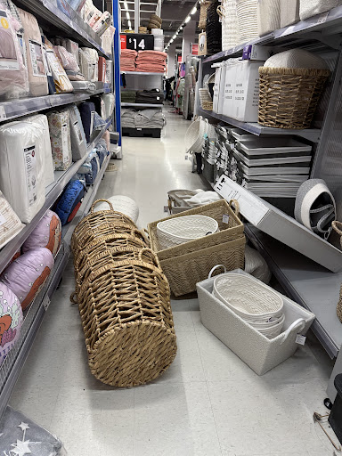 Poor/sloppy display of clothing on racks and on shelves. Clothing racks are so full that it is difficult to take clothes off without others falling or to return; hence the clothing either on the floor and thrown over the rack. The position of the checkouts should be moved closer to the exit as it will save us the hassle of unpacking our bags as we leave. Went a few days later and could not walk down this aisle for health and safety reasons. Maybe 24 hours is a stretch for staff.