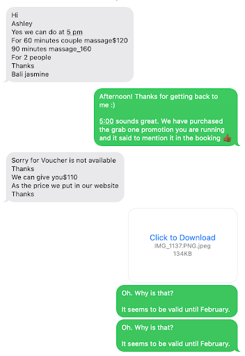 I messaged the owner to let her know of our experience and she basically said it was because my body didnt react to the hands of the masseuse and it couldn't be her fault because she has 30 years experience. I'd be very concerned if she had 30 years experience. I get a better massage when I badger my...