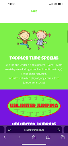 Iâm really disappointed with my experience at Jumperuma today. I came on Tuesday and paid $12 for Toddler Time, (wasnât told Jungleruma was closed). However, when I returned Thursday at 11:30 AM, I was told Toddler Time wasnât available due to Jungleruma being closed and was charged $16 instead of $12âeven though the website clearly states that Toddler Time runs from 9 AM to 12 PM.
