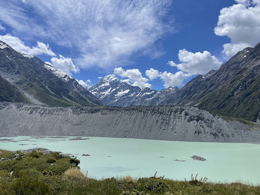 At the end of the track, youโre rewarded with breathtaking views of Mount Cook, the Mueller Glacier, and the glacial lake below. Itโs a great spot to take photos, soak in the serene atmosphere, and admire the natural beauty of New Zealandโs Southern Alps.
