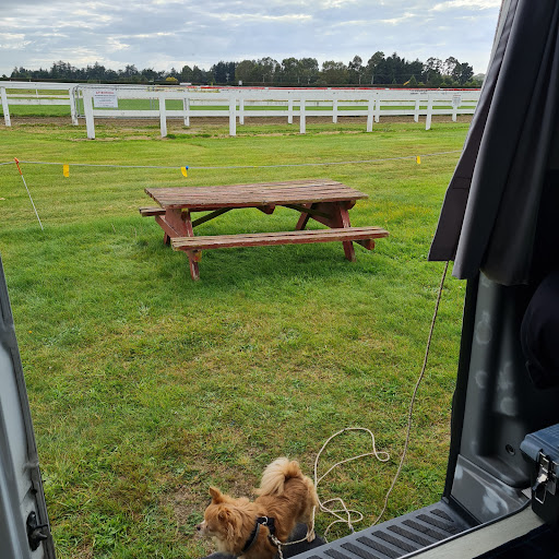 Very grey, dismal, decrepit place when I arrived but later sun came out the scene changed completely. Much nicer. Huge area. NZMCA members can stay, $10 per night per van now 08/03/22. Shower and toilet proved. Bit grubby but do the job.. bring your jandels. Nice to watch horses training, except the dude in diesel small truck towing horse spewing fumes all over poor horse. bear.the.dog101 liked supervising...