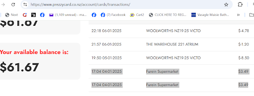 I was just able to check the card balance of my prezzy card as of this writing. On 4/01/2025, at 17:04, I used my Prezzy Card to pay for the small Doll Spring Roll Pastry. I swiped the card and the Male Checkout operator said that it was declined. I told him that the prezzy card takes the form of cash. Then, he made me try one more time. So, I swiped again, and the Checkout Operator said, it was declined and that he advised me that your establishment was not accepting prezzy card. As I did not want to argue with the Male Checkout Operator, I was prompted to use my debit card to pay for the Doll Spring Roll Pastry worth $3.49.