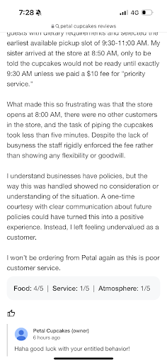 I had an extremely disappointing experience with Petal. I ordered cupcakes online for my wedding guests with dietary requirements and selected the earliest available pickup slot of 9:30-11:00 AM. My sister arrived at the store at 8:50 AM, only to be told the cupcakes would not be ready until exactly 9:30 AM unless we paid a $10 fee for "priority service."