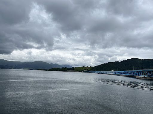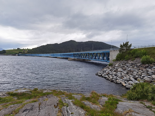 Bergsöysund-Brücke , Teil der E39 die nach Kristiansund weiter führt. Die Brücke hat eine Weite 845 m und ist eine Schwimmbrücke, die auf 7 Pontons ruht - sie ist in der Lage einen Gezeitenunterschied von +/- 2 m auszugleichen .. tolle Leistung und sieht zudem optisch sehr ansprechend aus. Vor der Brücke ( Richtung Kristiansund ) ist ein kleiner Rastplatz mit Toilette ... schöner Platz von dem man auch wunderbar die Brücke fotografieren und...