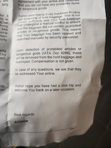 Just checked my backpack, tried to find my power bank and found this paper talking about "dangerous gods" instead of "dangerous goods". I didn't bring Odin, Thor and Loki with me and don't like this patronising tone from people who could have sent an email (it was registered to the booking of the ticket, after all) while they can't write an important message properly. And if I could do Tromso-Longyearbyan with that powerbank in the bag I registered, I don't know why I couldn't do the other way around. I didn't find that powerbank in the island after paying 80 euros to the...