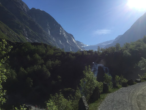 Details: we travelled to Briksdalbreen from Bergen on our way up to Nordkapp over the next few days. The weather was stunning but not too hot, and the parking was free. On the drive up, there are so many waterfalls to see all around you.