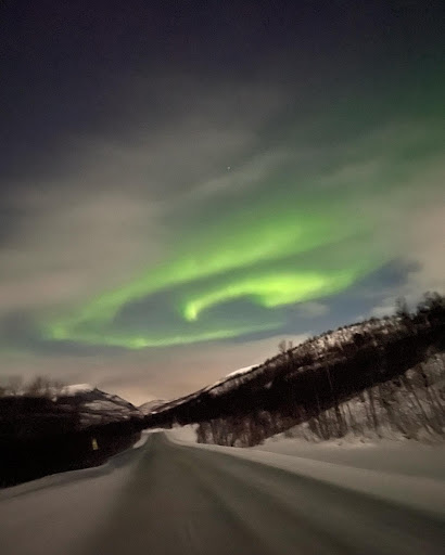 We began at 19:30 or 7:30pm and arrived home at 03:30 the following morning. There had been activity all day in Tromso. The evening and night was fraught with showers, thunderstorms and clouds. We ended up travelling to the Norway/Finland border . All of a sudden, the Northern Lights began to sparkle.