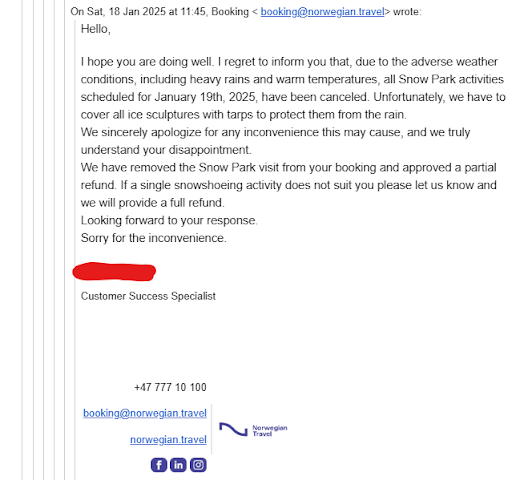 More than an hour later I tried to reach Norwegian Travel by chat. First, I was told that they can't help me because the chat is only for the Tromsø branch and I should contact the Snow Hotel. After I expressed my dissatisfaction they finally acknowledged that there had been "an issue" (what an understatement!) with transportation and they offered to refund the tour.