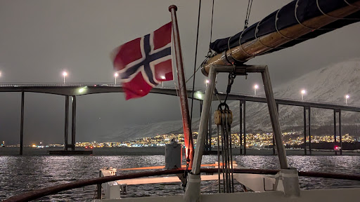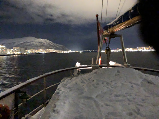 The islands are pretty from the fjord and there were parts just not seen from our bus trips about. It was snowing harder as we came back to the port. After eating, my wife and I had come back up onto the deck and it was lovely, sitting warm and full being snowed on as we came through back under the bridge. A lovely way to spend the evening in Tromsø.