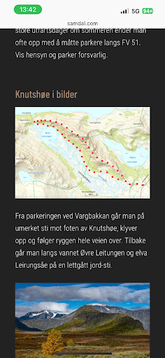 Read moreKnutshøe is such a beauty! Loved this hike. Only do it in good weather, both for safety and for the views. Read about the route and prepare before you do it🌱 Avoid doing it before mid july to leave the birds alone🦅the best starting point is from the parking lot, over the mountain(s) and then back through the valley. There are a couple of climbs, so those are easier to do upwards instead of downwards… little note: Heavy dogs might find the climbs difficult. The first climb (often considered the hardest one) in the very beginning can be avoided if you go an alternativ path (see picture). Do a proper research for it in the online mountain foras, and be sure to follow the right track during the whole hike. The second climb is just before the peak. It was fun, but I had butterflies in the stomack, and did not look down 🫣 The top is a nice place to sit down with your «matpakke»(food) or snacks - the views are amazing! When you finally reach the valley, it can be a bit muddy and slippery - use your best hiking shoes. Also bring your mosquito spray! And maybe a swimsuit. Walking the valley is so calming and pittoresque, and the perfect end of this adventorous hike! Enjoy💛 Ps: only walk this when good weather. The path is mostly unmarked. Bring lightweight clothes for all types of weather. Bring food and plenty of water! Plan plenty of time so you can enjoy the...