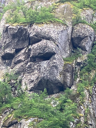 Further long, another ancient with hollow ears, one dark staring empty eye, blobby nose and three big granite teeth, one missing, gap-toothed. Been in a fight? With no kindly healing dentist to hand, the troll’s tooth just fell into the fjord a thousand years ago, and he’s still not happy about it.