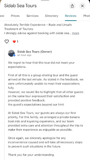 Thank you for your reply. While you mention arranging a private banana boat ride and kayaking for our family, we’d like to clarify that these activities were already included in the package we paid for and were not something extra or specially arranged for us. Highlighting this in your response feels like an attempt to deflect from the real issue.