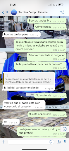 Confié en que, por tratarse de una empresa, harían un buen trabajo, pero lamentablemente no fue así. Posteriormente, me informaron que debía pagar por un arreglo adicional, lo cual estoy seguro fue causado por el mismo técnico. Adjunto fotos de la conversación para que vean cómo tuve que estar constantemente escribiendo para obtener noticias. La reparación tomó casi un mes y el técnico no pudo identificar la falla después de 10 días de revisión. Además, cuando finalmente me entregaron la laptop, no incluía el cable de carga original.
