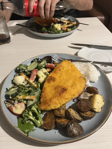 This place is amazing! We have already eaten here dinner twice and will be coming back. You get a big appetizer (if you get the salad it comes with tons of different and very fresh veggies) and a main course with delicious roasted potatoes, chicken rice and lots of salad, AND a dessert! Ask for the chicken milenasa it was so good. The quality, quantity, and price...