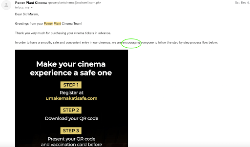 ย ย ย Read moreThis is the first time I was disappointed with the service of Power Plant Cinema because of the STAFF. We watched The Eternals on Dec. 4, 3:30pm showing. We paid the tickets online and received an email, which "encouraged" moviegoers to register on the umakemakatisafe website and to bring their vaccination cards. We brought our vaccination cards for sure. But we didn't think the registration on the said website was REQUIRED because the wording in the email indicated it was only ENCOURAGED. What's more, your posters outside the cinema houses didn't say it was required. In fact, the only time people find it out it's required is when the staff asks for it and inside the movie house when the ad about the registration plays. Anyway, this could have been a SMALL ISSUE for us, if not for the STAFF IN FRONT of the movie house.