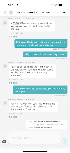 當天(2025/6/23)早上天氣惡劣、風雨交加,我主動聯繫客服詢問是否會因安全因素取消行程。對方先是說航班仍照常進行,中午會再通知。直到 12:33 才回覆航班因天氣暫停,詢問我是否改期。我表明「當晚就要離開長灘島」,明確要求取消行程。