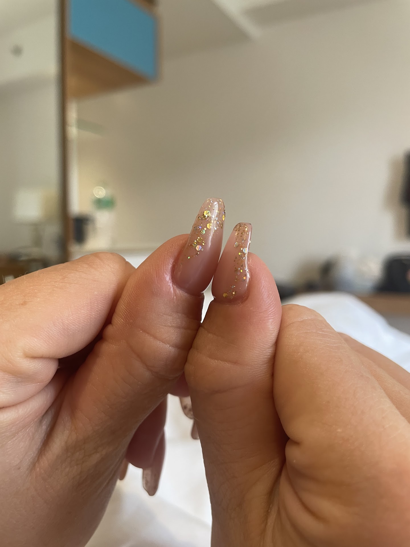 Also picture comparison of nail she repaired on right to nail she filled in on left, she made a fully different sized, bad quality nail 😂 This nail she made is the only one that came off now 2weeks after getting them done.