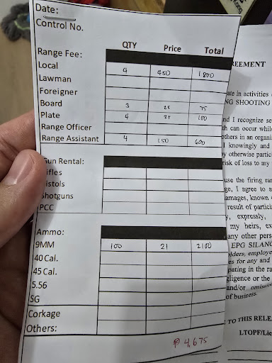 I went here on a Monday with my parents when ARMSCOR, Makati was closed for 2 days. It's a very spacious range with an option to shoot between 9mm (₱15) and 45.acp (₱16) per bullet for the Colt 1911 Pistol. The instructor was very polite, gentle and can match your pace of learning. I recommend this shooting range as a plan b if your desired range is closed...