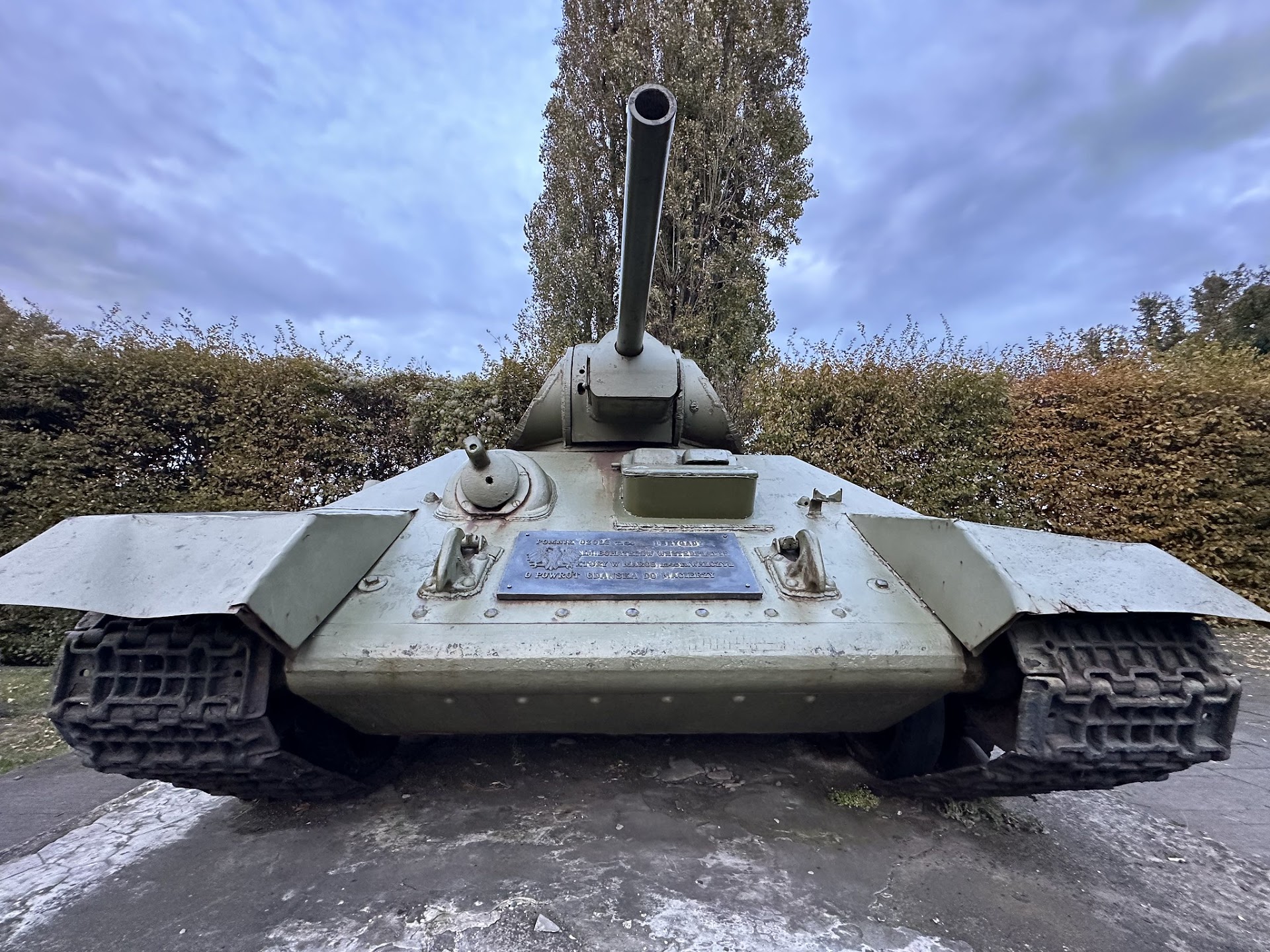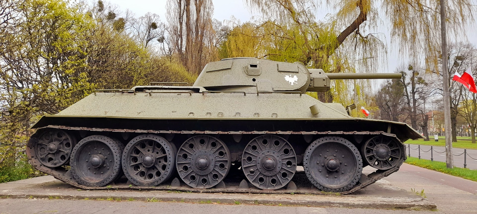 Jest to czołg T-34 wersji 1941, obecnie jest to egzemplarz absolutnie unikatowy, gdyż w toku działań wojennych zdecydowana większość czołgów tego typu uległa zniszczeniu, a po zakończeniu wojny reszta została pocięta na złom. Czołg jest nazywany "czołgiem porucznika Miazgi", jego koła pochodzą z kilku pojazdów tego typu lecz różnych wersji, również kadłub i wieża są od różnych egzemplarzy, co było normą w czasie wojny (w warunkach przyfrontowych z kilku rozbitych maszyn składano jeden sprawny pojazd). Użycie czołgu tej wczesnej wersji wskazuje na duże ubytki sprzętowe Brygady (awarie i straty bojowe), zaś na kadłubie można znaleźć zaspawany otwór po bezpośrednim trafieniu pociskiem przeciwpancernym (znaczy to, że czołg był gruntownie wyremontowany po poprzednim zniszczeniu i ponownie skierowany do linii). Wbrew temu co głosi tablica nie jest to czołg Brygady jaki pierwszy wjechał do Gdańska - pierwszym był czołg typu Sherman jakie też były na uzbrojeniu Brygady. Więcej informacji na...
