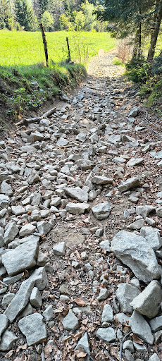 Wspinaczka zajęła nam 45 minut. Droga prowadzi w górę, najpierw przez pola, potem wchodzi się do lasu. W lesie ścieżka jest praktycznie cały czas kamienista i jest dosyć stroma. Bliżej szczytu szlak niebieski jest dziwnie oznaczony - na drzewach zauważyliśmy, że poprzednie oznaczenia zostały zamalowane na zielono, a dodatkowo coś tam jest wycinane lub planowane pod budowę czegoś.