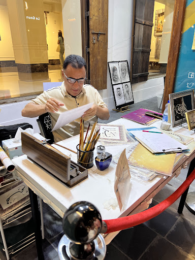 عند زيارتك للقسم، ستُدهش من روعة التفاصيل والدقة في كتابة الأسماء والآيات والزخارف. ما يميز الأستاذ علي ليس فقط مهارته العالية، بل أيضاً لطفه وتعامله الراقي مع الزوار، حيث يشرح لك أنواع الخطوط المختلفة (كالثلث، والنسخ، والديواني، وغيرها) ويساعدك في اختيار الشكل الأنسب لاسمك.