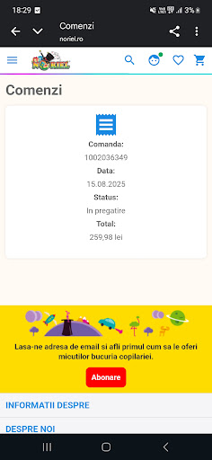 Read moreCel mai neserios personal!!! Ma opresc aseara sa își aleagă fetele cadourile, o rog pe doamna din magazin (aflu azi ca o cheamă Maria) dacă se poate sa le rezervam pana dimineața cât sa nu plec cu ele din magazin sa ma vadă copilele, le și puteam achita doar sa le iau astăzi din magazin și ce credeti, azi dimineața nu am mai găsit unul din obiecte. Ceea ce aseara era sigur și fără probleme (ca sa o citez pe doamna respectiva) astăzi nu mai era disponibil, fiind ultima bucata din tot magazinul/site-ul Noriel (nu mai zic ca nici prin cap nu mi-a trecut sa fi făcut aseara o poza, sa pot cauta astăzi in alta parte). Dezamăgirea copiilor mei nu o suporta nici doamna și nici Noriel, doar eu! Da, înțeleg, nu avea nicio obligație sa îmi păstreze jucăriile nici rezervate si nici achitate. Nici eu nu am nicio obligație sa ma port civilizat doar bunul simt si cei 7 ani de acasă, responsabilitatea si cuvantul dat ma fac sa ma port așa cum se cuvinte si sa respect ceea ce îmi asum. Noriel îți doresc sa ai clienți pe măsura...