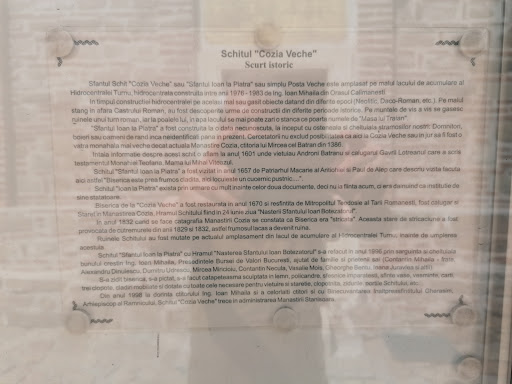Nici până astăzi nu se cunosc, nici data zidirii şi nici numele celor care l-au ctitorit. Cercetătorii nu exclud posibilitatea ca aici, la Cozia Veche, sau în împrejurimi, să fi existat o vatră monahală mai veche decât cea de la Cozia, datând probabil, de la sfârşitul secolului al XIII-lea, sau construită la începutul secolului al XIV-lea de către Radu I, tatăl lui Mircea cel Bătrân. Schitul este atestat documentar la 8 noiembrie 1601. La această dată, monahia Teofana, mama lui Mihai Viteazu, în actele donaţiei pe care o face către mănăstirea Cozia, menţionează numele a doi dintre vieţuitorii acestui schit. Dintr-un alt document, aflăm că Patriarhul Macarie al Antiohiei şi însoţitorul său, Paul de Alep, au vizitat schitul la 29 iunie 1657, remarcând faptul că "biserica este prea frumos clădită”, şi că „aici locuieşte un cucernic pustnic", la rugămintea căruia Patriarhul sădeşte un vlăstar de nuc spre binecuvântarea lăcaşului. Prin urmare, schitul "Sfântul Ioan la Piatra" nu ia fiinţă acum. El exista deja ca instituţie de sine stătătoare, înaintea celor două documente. Biserica de la "Cozia Veche", având hramul „Naşterea Sfântului Ioan Botezătorul”, a fost restaurată în anul 1670 şi resfinţită în acelaşi an, la 24 iunie, de ziua hramului, de către mitropolitul Teodosie al Ţării Româneşti, fost călugăr şi stareţ al Mânăstirii Cozia. Ultima menţiune documentară despre viaţa schitului datează din 8 septembrie, 1837. Ruinat în prima jumătate a veacului al XIX-lea, schitul a fost mutat pe actualul amplasament în anul 1986, prin sârguinţa şi efortul bunilor creştini din...