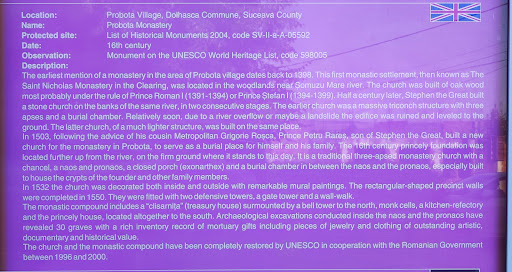Manastirea Probota a fost ridicata de Petru Rares, pe locul vechii biserici, in mai multe etape: biserica in 1530, pictura in 1536. Zidul de incinta a fost ridicat in 1550. Este necropola domneasca. Pictura apartine unui mester cu serioase cunostinte si notiuni de perspectiva geometrica, apropiate de cele ale contemporanilor sai din tarile Renasterii occidentale. Tema "Apocalipsei" reprezinta aici o adevarata manifestare de viziune fantastica moderna. Biserica este zidita in plan treflat, cu interiorul compartimentat in altar, naos, camera mormintelor (gropnita) pronaos si pridvor, despartite prin ziduri de piatra, cu usi de comunicare intre ele. Altarul si absidele laterale sunt poligonale in exterior si semicirculare in interior. Absida altarului este prevazuta cu cele doua nise adanci obisnuite: proscomidia si diaconicul, avand fiecare cate o ferestruica mica. Turla este octogonala, deschisa pe naos si luminata prin patru ferestre. Pronaosul, de plan dreptunghiular, este strabatut de cate doua mari ferestre cu ancandramente de piatra. Biserica, cu peretii foarte grosi, are lungimea de 32, 2 m, latimea 9 m si inaltimea maxima 27, 7 m. Alte doua contraforturi sunt la pridvor si unul mai scurt la altar. Soclul bisericii este din piatra cioplita. Impodobirea fatadelor este data de randul de firide ce inconjoara biserica sub cornise, mai putin la pridvor. Firidele au fost la inceput pictate, dar azi pictura nu se mai vede. Caracteristica pentru arhitectura Probotei este preferinta pentru detalii si profilatura de traditie gotica. Tabloul votiv il prezinta pe Petru Rares impreuna cu familia. In Cripta domneasca se afla mormintele lui Petru Rares si sotia sa, Elena, al fiului lor Stefan si alti membrii ai familiei. Probota a fost un important centru cultural, aici formandu-se vestitii carturari ai epocii: Dosoftei, Grigore Rosca, Gheorghe Movila. Biserica a fost împodobită în 1532 cu valoroase fresce interioare şi exterioare. Pe zidul dinspre sud se pastreaza pisania in limba slavona, cu urmatorul continut: "Cu vrerea Tatalui si cu ajutorul Fiului si cu savarsirea Sfantului Duh, iata eu, robul Stapanului meu Iisus Hristos, Io Petru Voievod, cu mila Lui Dumnezeu domn al tarii Moldovei, fiul lui Stefan Voievod cel Batran, a binevoit domnia mea cu buna mea voie in a 4-lea an al stapanirii (mele) imparatesti, a zidi acest hram intru numele Arhiereului facatoru de minuni Nicolae, fiind egumen chir Grigore in anul...