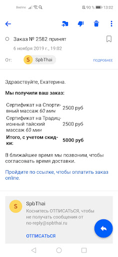После ответа Дату посещения я написала сразу (выше), продублирую - 09.01 20:00 Заказ абонемента оформлялся на сайте ещё 06.11, тогда этот массаж назывался "спортивный массаж" без слова "ойл". Точно с таким же названием мне пришло подтверждение на эл.почту. По-этому пишу "не ойл". Прилагаю скрины сделанные на сайте только что, там у Вас разные названия. В чем разница тогда, не пойму. Про кимоно там точно ничего сказано не было - это не то. Я взяла сертификат на 2 массажа, второй как раз на традиционный тайский о котором Вы говорите с кимоно. Ну, раз Вы говорите, что с массажем путаницы не было, пусть так.. Смотрела отзывы одного из Ваших филиалов в городе (не помню какой) там писали, что слабовато. В ответе администрации было написано, что в следующий раз просили мастера мужчину. Как и сделал муж. Но, возможно, мастер мужчина только в том самом центре, и по-этому администратор не предложил обратиться туда. Девочки тоже мнут хорошо, - сказал он. Ну что поделать, сертификат уже на руках, значит записываемся к кому есть. Выходит с Вашей стороны вины нет. Просто мнут слабовато.. Для больших крепких мужчин -...