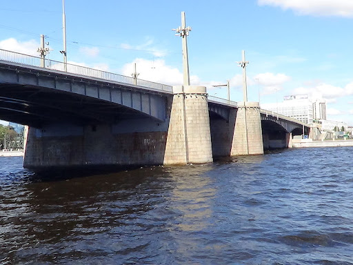 Read moreОдин из моих любимых мостов! На него очень сложно попасть, разметка не позволяет (кто автор?!). С Кантемировской улицы прохода прямо на мост нет, надо обойти по тротуару до Выборгской набережной, и по пешеходному единственному переходу подойти к высокой лестнице, с пандусом для колясок, чтобы попасть на мост. А со стороны Петроградки по проспекту Медиков надо обойти мост и перейти по трём пешеходным переходам, что невсегда безопасно... Вместо нескольких метров по прямой... на мост с постепенным подъёмом вверх. Неужели нет других возможностей попадания на этот замечательный просторный шириной 31метр мост? По которому так приятно прогуляться от начала до конца и наоборот 664 метра в одну сторону!!! В 2022г мосту исполнится 40 лет. Юн по сравнению с другими 200-300 летними мостами нашего города! А мост люблю, и виды на Большую Невку, набережные!.. Аура...