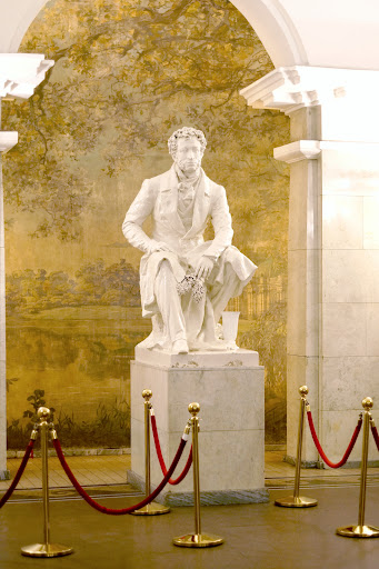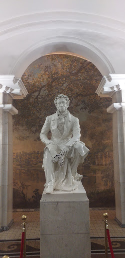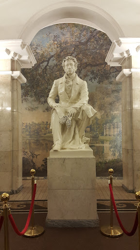 В торце подземного зала станции установлен памятник А.С. Пушкину за авторством Михаила Константиновича Аникушина (1917-1997) и пожалуй этот памятник самый "светлый" из всех памятников Пушкину в Санкт-Петербурге, возможно потому, что он выкрашен в глянец цвета слоновой кости. По крайней мере данная скульптура и правда не несет такого печального образа как бронзовая скульптура А.С. Пушкина на станции "Черная Речка", автором которой так-же является М.К. Аникушин, хотя понятно, что тематика станций кардинально разная и скульптуры это удачно подчеркивают.