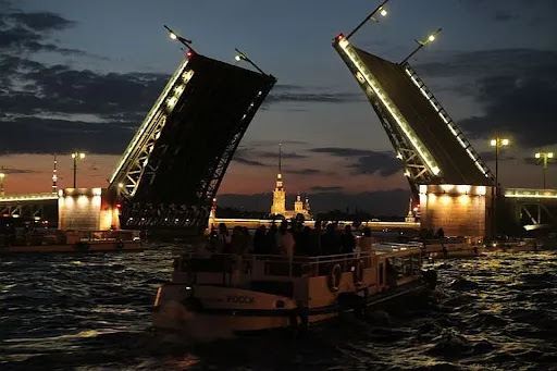Но настоящее волшебство начинается, когда Дворцовый мост разводят. Под звуки музыки и восхищенные возгласы толпы, огромные крылья моста медленно поднимаются, открывая вид на проплывающие корабли и отражения огней города в темной воде Невы. Белые ночи добавляют этому зрелищу особую атмосферу – светлое небо создает ощущение сказки и нереальности происходящего.