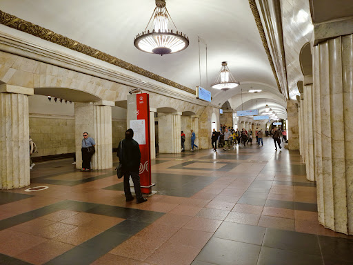 Read moreКрасивая станция, помпезная, я бы сказала. Станция начала свою работу 1 января 1950 года. «Курская» считается одной из самых крупных станций Московского метро. Протяженность ее платформы составляет приблизительно 160 метров. Темы оформления станции – «Солнце» и «Победа». Пол станции выложен красным и серым гранитом. Сразу четыре цвета мрамора использовалось для оформления станции – серый, черный, розовый и красный. Архитектура и оформление вестибюля очень схожи с храмовыми постройками. Вход в «Храм Победы» ориентирован на запад. В восточной части находится углубление, напоминающая алтарь, в которой когда-то стояла скульптура Сталина. В оформлении используются символы, указывающие на 16 союзных республик (например, купол напоминает солнце, лучей...
