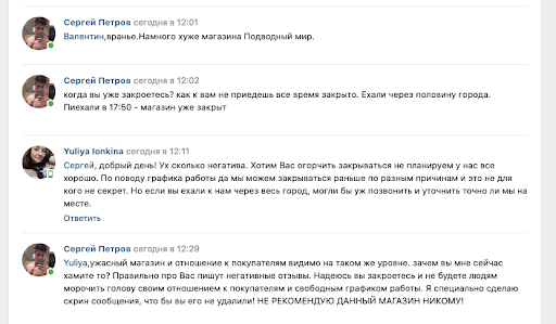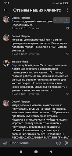 Добрый день! Хочу от имени компании написать опровержении ложного отзыва от ВДВ Десантура. Этим человеком оказался Сергей Петров, в первый раз он написал нам ВКонтакте в наших отзывах о том, что не смог попасть в наш магазин. Его это очень растроило. Попутно начал сразу писать нам гадости. Ведя себя совершенно не адекватно. Тут же у нас появляется отзыв в 2гисе от ВДВ Десантура, о том что он был в нашем магазине, мы ему нагрубили, при этом он купил у нас рыбу, которая погибла через 2 дня. Что для нас сразу показалось странно, так как рыба проходит обязательный карантин и адаптацию. Но по началу мы не связали этот пост в 2гисе с Сергеем. А на следующий день, опять ВКонтакте, на мой последний комментарий, о том что кто ему грубил, Сергей начал мне скидывать скрины, что написал во всех соц сетях про нас гадости и мы не сможем удалить эти комментарии (скажу больше мы их никогда не удаляем 🤭). И как раз в Гугле тоже висел его комментарии от ВДВ Десантура, вот тут то нам все стало ясно))) Сергей сдал сам себя и мы поняли, что это одно и тоже лицо. Ведь как мы смогли умудриться нагрубить человеку, когда магазин был закрыт и как он умудрился купить у нас рыбу при не работающем магазине?! 😁😁😁 Противоречит сам себе. И ещё Сергей написал, что мы подтираем его комментарии. Это абсолютная неправда. Нам скрывать нечего, его комментарии ВКонтакте так и висят в наших отзывах. Всю переписку прилагаю со скринами. И судя по его странице ВКонтакте, эта страница однодневка. Возможно этого человека зовут и вовсе не Сергей. И эта страница ему служит прикрытием, чтобы писать необоснованные гадости про другие организации. Но если нет, то тут стоит задуматься в адекватности человека. Как только на второй день он начал мне скидывать скрины, сразу же добавил меня в черный список, что очень странно и согласитесь очень удобно писать гадости чувствуя себя...