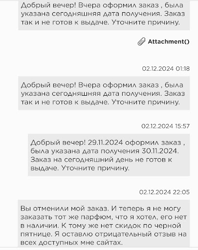 Read moreХотел бы оставить отзыв о моем заказе через интернет магазин. Осуществлял заказ туалетной воды с самовывозом из магазина ЛЭТУАЛЬ в ТЦ «Европа». Заказ был оформлен 29.11.2024 , дата получения была указана 30.11.2024. Наступил долгожданный день получения заказа и собственно говоря статус заказа с «Оформлен» не изменился. Создал обращение , фото которого прилагаю, и оно было проигнорировано. Неделю я пытался достучаться до магазина, после чего получил отмену заказа и подарок в виде 200 бонусов (можете оставить их себе в виде чаевых).Также, телефон магазина был недоступен. Я очень огорчился и попытался переоформить заказ, но к великому сожалению (или счастью) данной туалетной воды уже не было в наличии. Я рекомендую вашей службе улучшить обратную связь и актуализировать наличие товара. Даже если это когда-либо и произойдет, покупать в данной сети я больше ничего не планирую из принципа. P.S. У ваших конкурентов таких проблем с клиентоориентированностью...