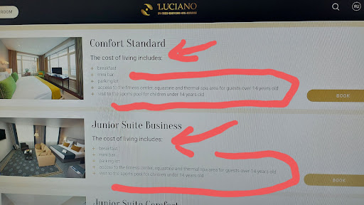 Read moreMy impressions are pretty much the same as the traveler few reviews below who rated it 2, however as we had worse experience I rate it 1 star. It's the only thing that put a shade on our Kazan trip.||Having a pool/spa on my journeys is very important to me, so I always book hotels with it. Luciano seemed nice, although pretty expensive (160 $ per night is very high for Kazan), but we accepted it and booked 2 nights via their website.||Our plane landed in Kazan from Moscow at 11.30 PM so we reached the hotel half an hour after midnight. A very unkind reception lady, without any smile asked for our passports. She held them for some 10 min after I asked her what's she doing. She explained she's making a copy of EVERY page and it's going to last for half an hour - I was shocked, thinking I was in a police station, not a hotel.||I wanted them back, as it's jeopardizing my privacy but she coldly refused explaining that's the law. LIE - because tomorrow we left this hotel and moved to another one where they normally scanned only the first page.||After some 30 min we were allocated our room which was in another part of the building and took almost 10 min to reach it by many corridors and doors in between them opening by a code, again like it's a police station. Room was nice, pretty new, but we were so tired we went to sleep immediately. ||Woke up at 8 and headed for a swim before breakfast like I always do. After some 10 min, while swimming, a "police squad" of 2 receptionists and a guard approached us by the pool demanding us to leave. I couldn't believe it. They explained we do not have the spa included, which I declined, and refused to leave. They made a scene down there, shouted at us and I simply couldn't believe such a behavior. I felt uncomfortable and humiliated in front of other guests, so we left and insisted to speak with the manager.||We went for breakfast which was on a 2 star hotel level - some low quality cold meats and cheese in cheap plastic trays.||The manager deputy awaited us in the lobby.||I brought with me my printed hotel confirmation with room description explanation what's included from the hotel's website (SEE my photo). Another shock, she told us that's just the "explanation" of the room, but we must pay 5000 Rub (70 $ !!!) PER DAY for spa use. I again showed her the print where it says "includes access to aquazone and thermal spa area", but she insisted. ||I told her if so, we would leave and cancel the other night. She calmly said that was our decision, showing no will to settle the issue. Again, I couldn't believe such a behavior to customers. ||We checked out right after that and found another hotel for our second night in Kazan, but it took some time and put a shade on our Kazan visit, which is btw a beautiful city.||I must express such arrogant and disrespectful hotel behavior I've never experienced in my life, in hundreds hotels I've stayed worldwide.||I strongly advise future travelers to...